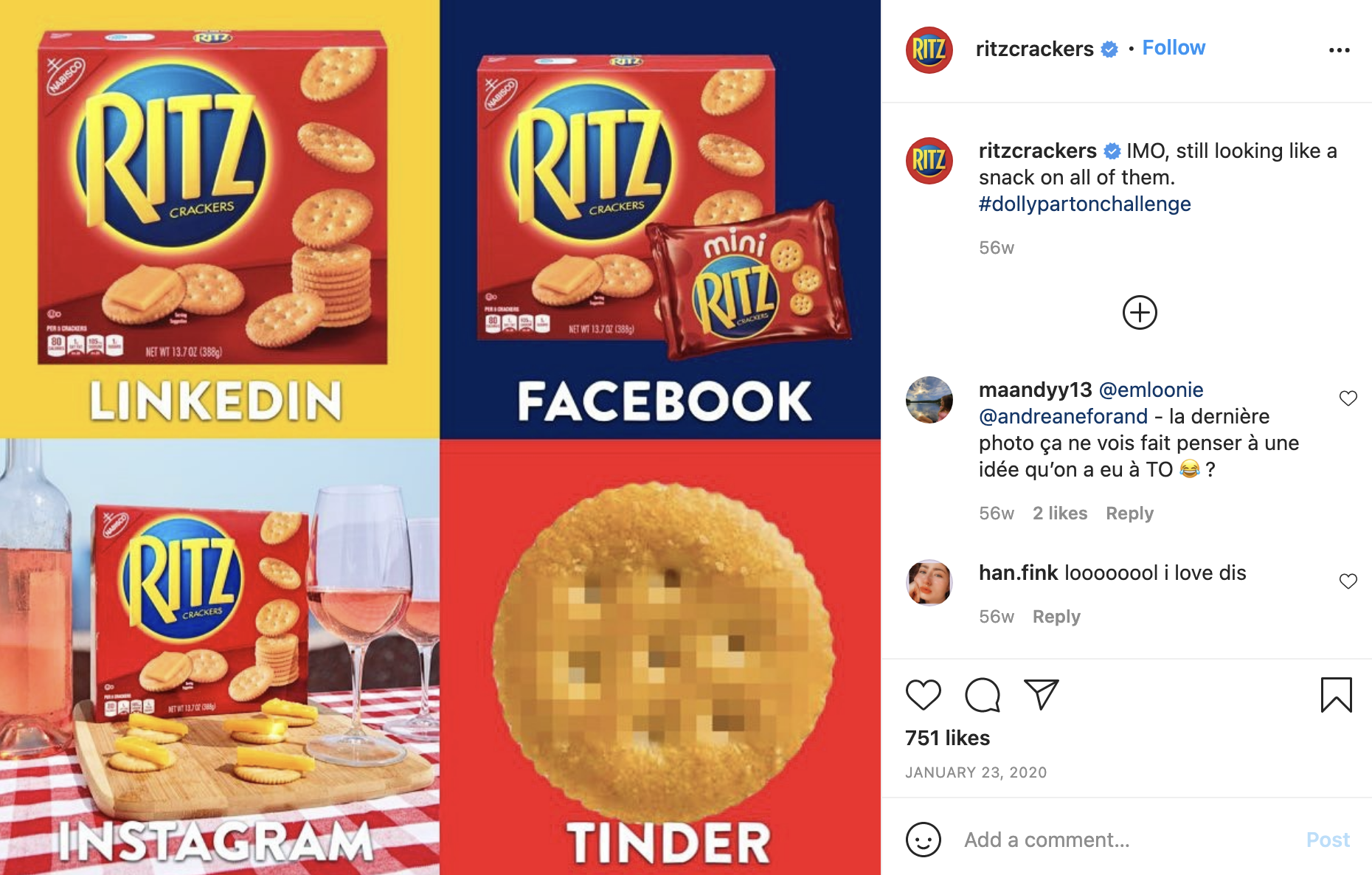 Ritz Crackers is one of many brands that participated in the #dollypartonchallenge on Instagram in 2020. While other posts on their account tend to range from 250-350 likes and under ten comments, this post garnered over 750 likes and 27 comments— a dramatic boost in engagement.