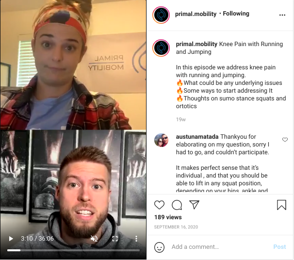Primal Mobility is a coaching service for athletes that uses Instagram to generate leads and connect with prospects throughout the sales funnel. They use a combination of live streams and IGTV to answer frequently asked questions and prove the value of their services to prospects in the sales funnel’s decision phase.