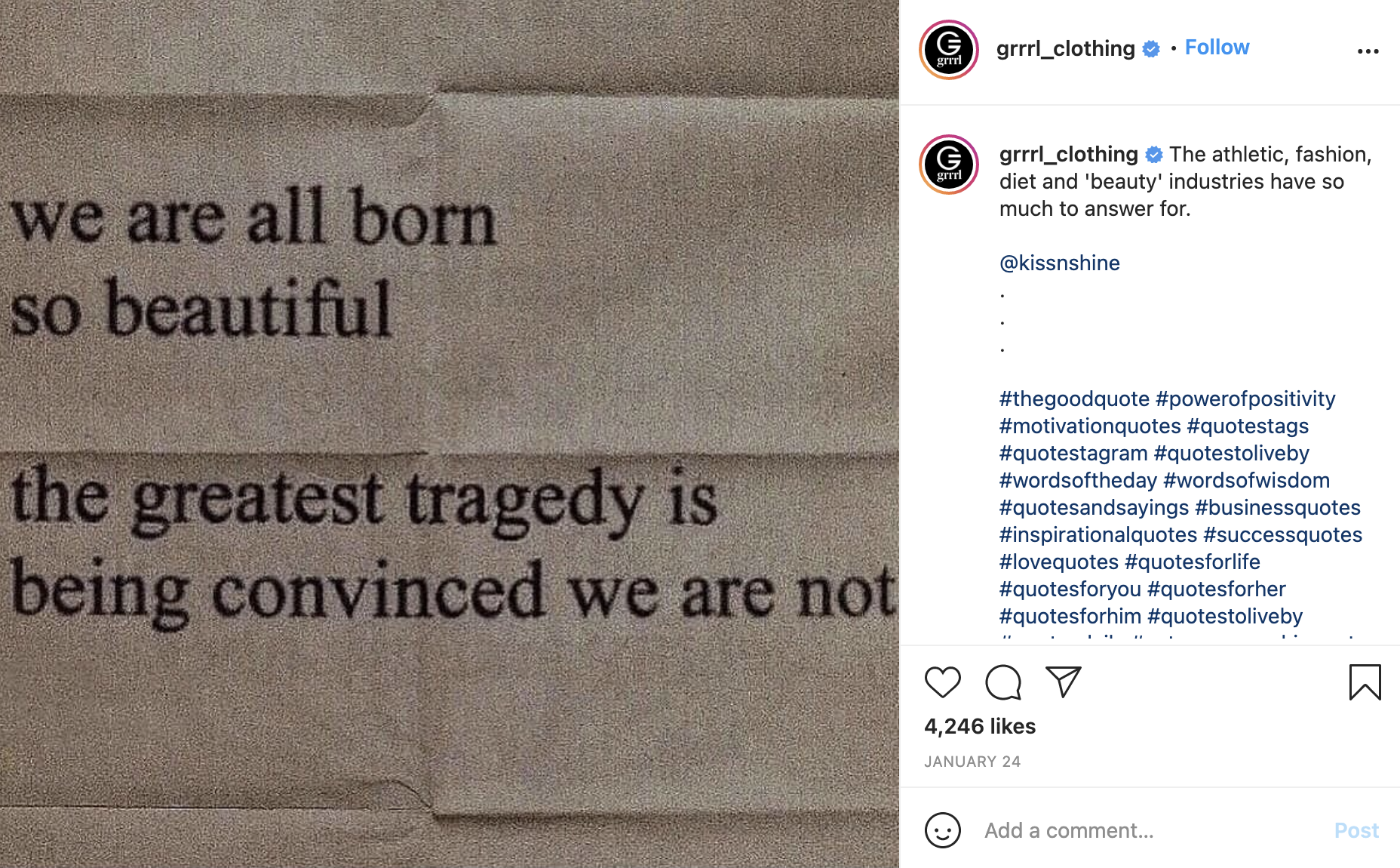 Grrrl Clothing is a brand that strikes a balance between selling products and promoting its overall brand mission. This brand’s approach shares stories of powerful women overcoming challenges and achieving self-actualization. These are the stories that get shared by followers and receive the most engagement. As such, more people see the sales-oriented posts when they enter the feed.