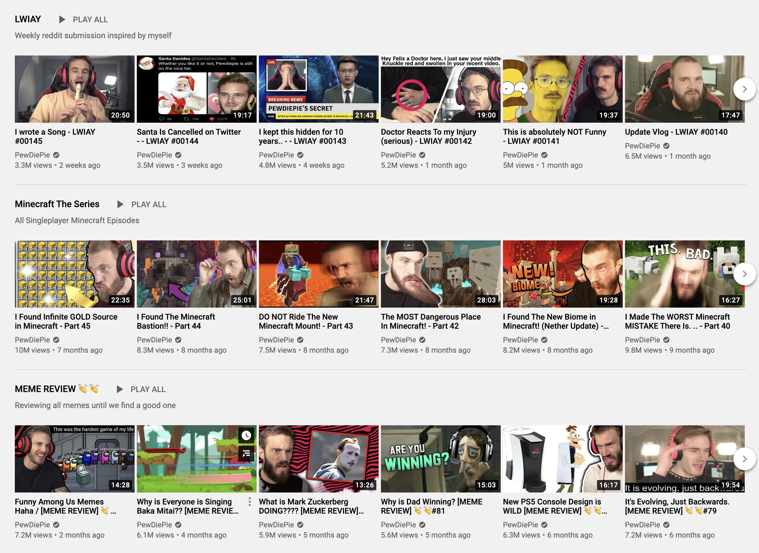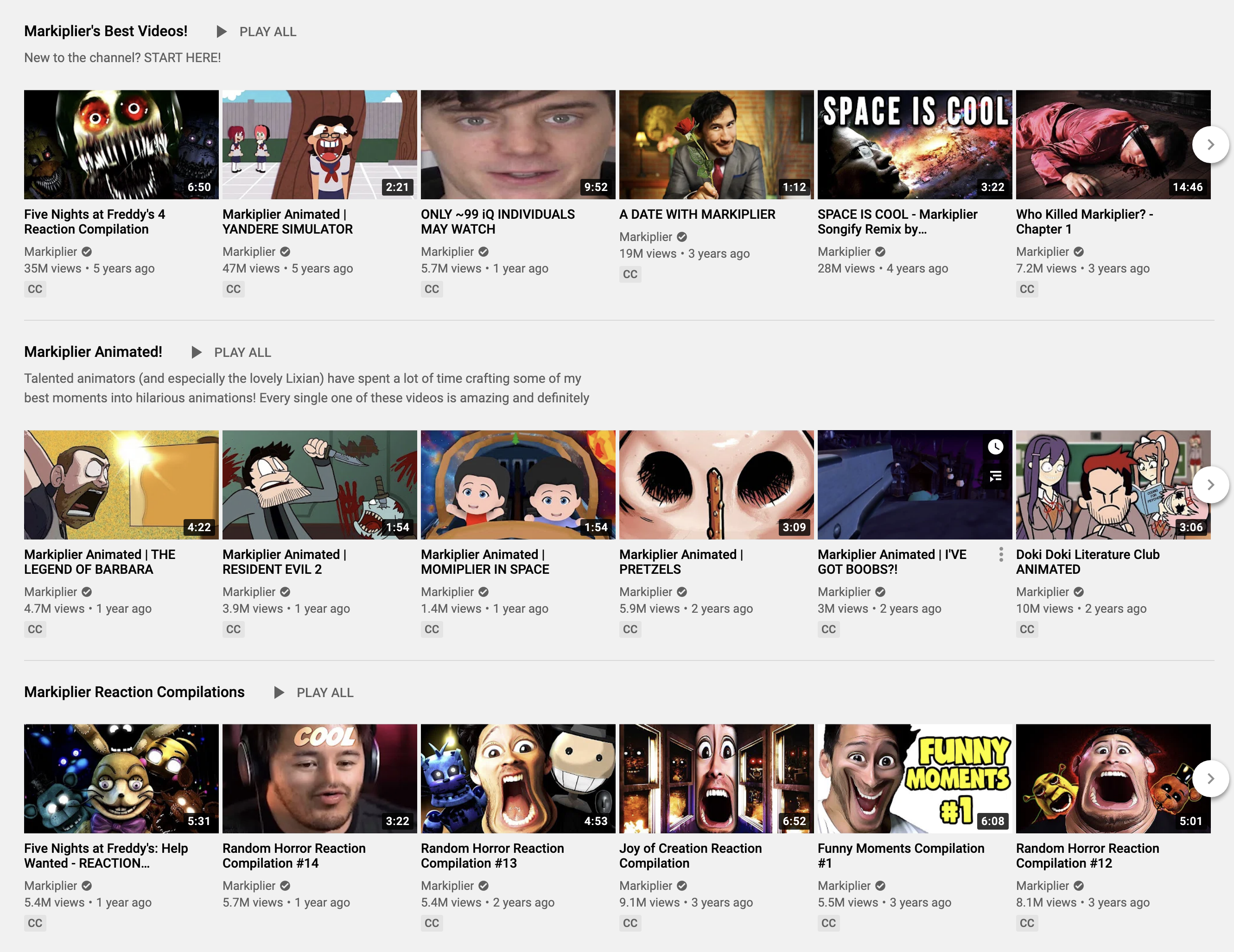 Markiplier is another popular YouTuber that makes excellent use of playlists. He drops his most popular videos into playlists so that new subscribers can quickly have access to his best content.