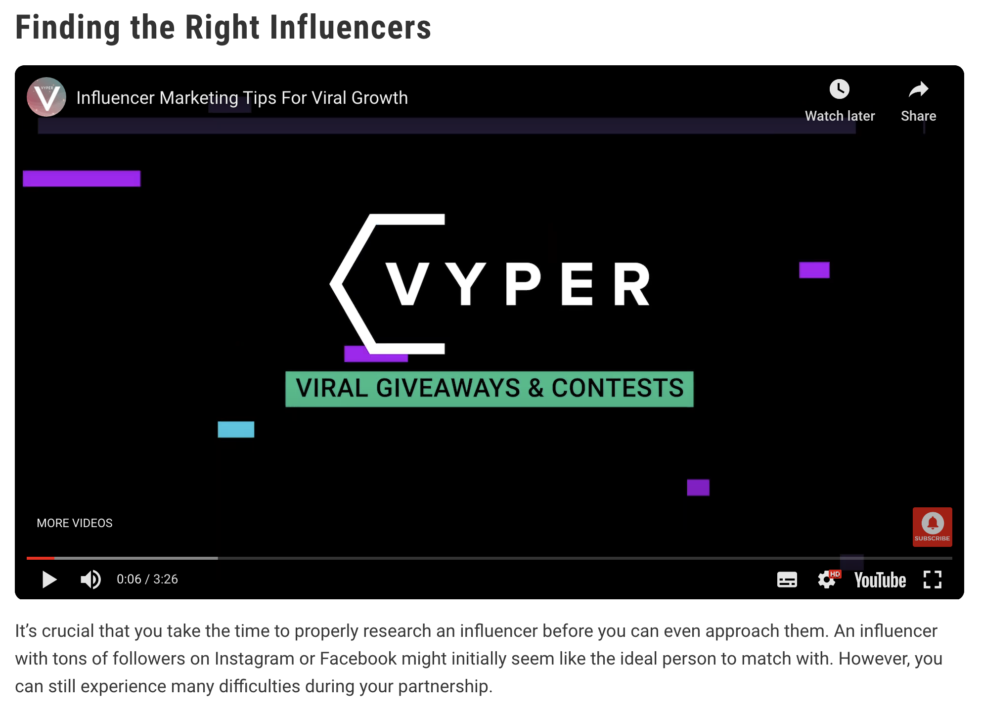 For the best results, only embed videos that are relevant to the post. For example, we inserted a video on influencer marketing (see below) into a post on influencer marketing strategies.