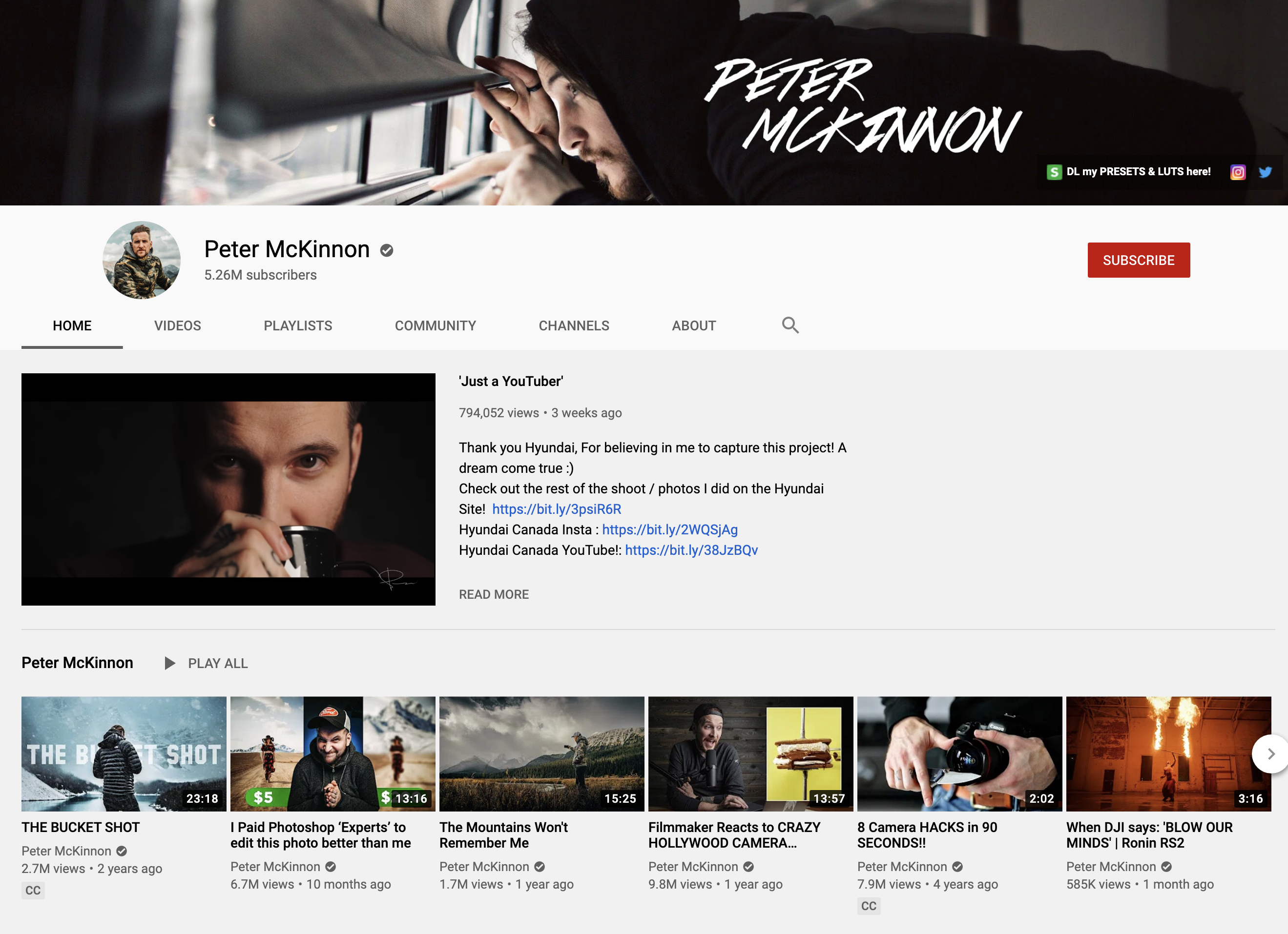 Peter makes excellent use of his channel trailer, which is titled “Just a YouTuber.” A powerful video that is meant for people that are new to his channel.