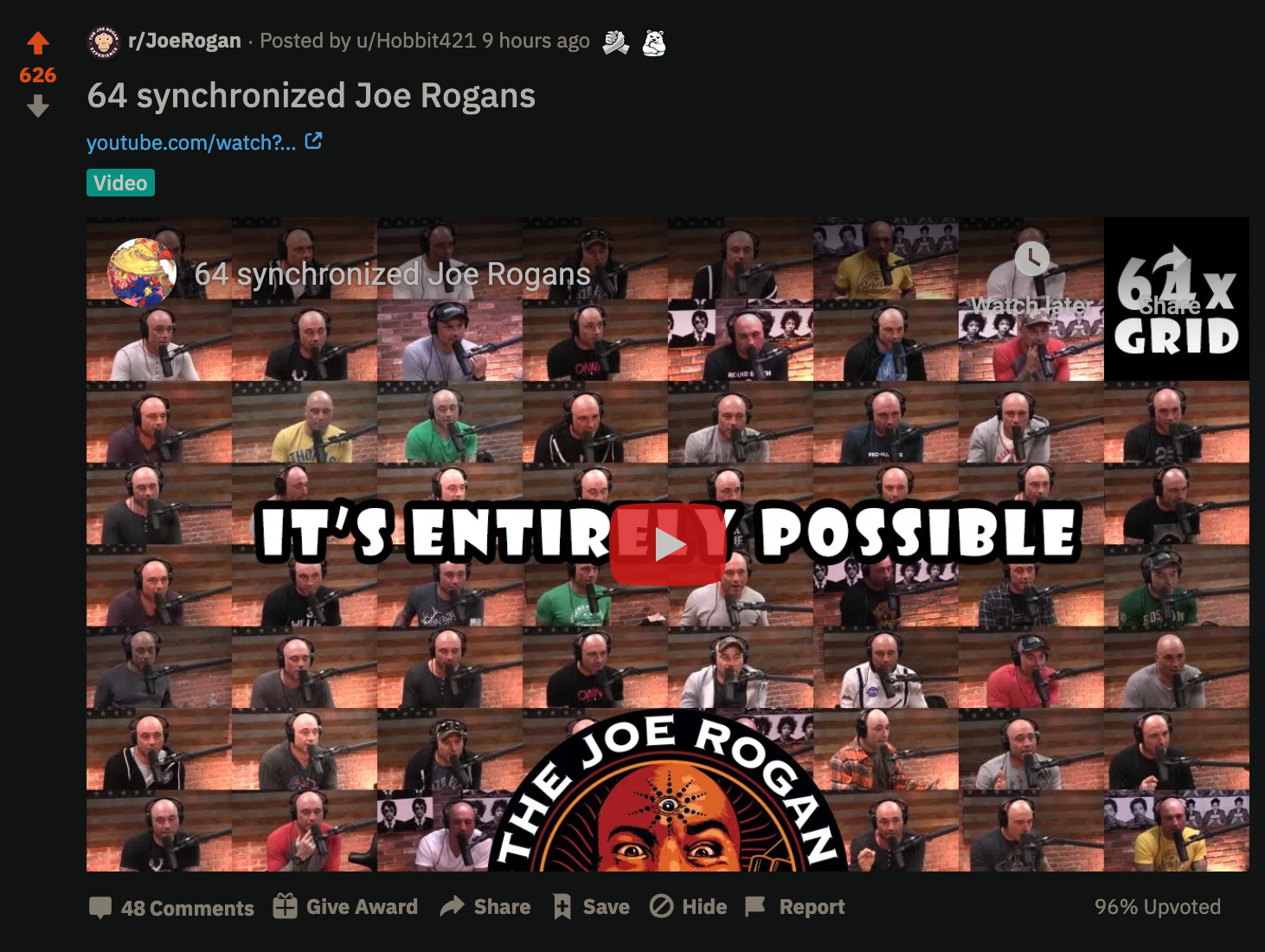 It’s common for YouTube users to share their videos on relevant Subreddits. For example, a fan-created a collage made up of clips of Joe Rogan saying the phrase “it’s entirely possible.”