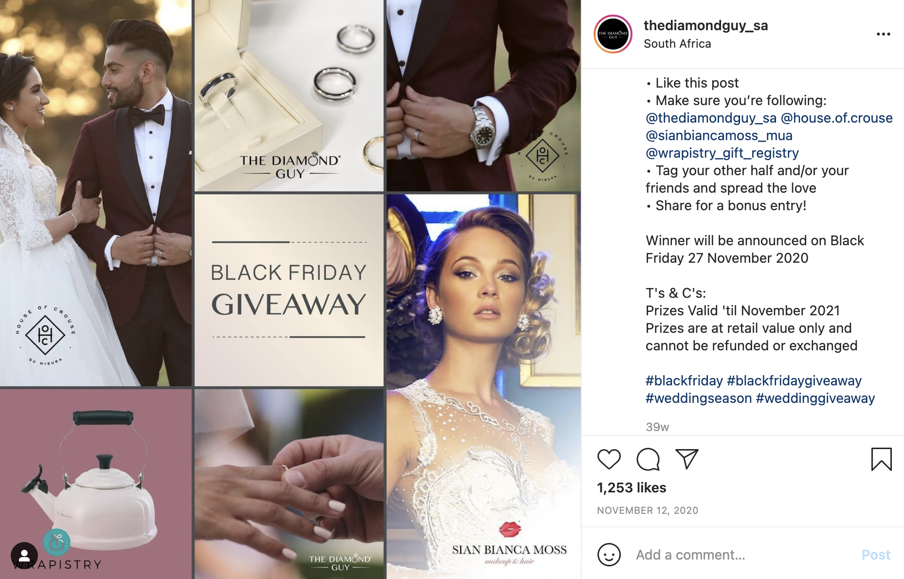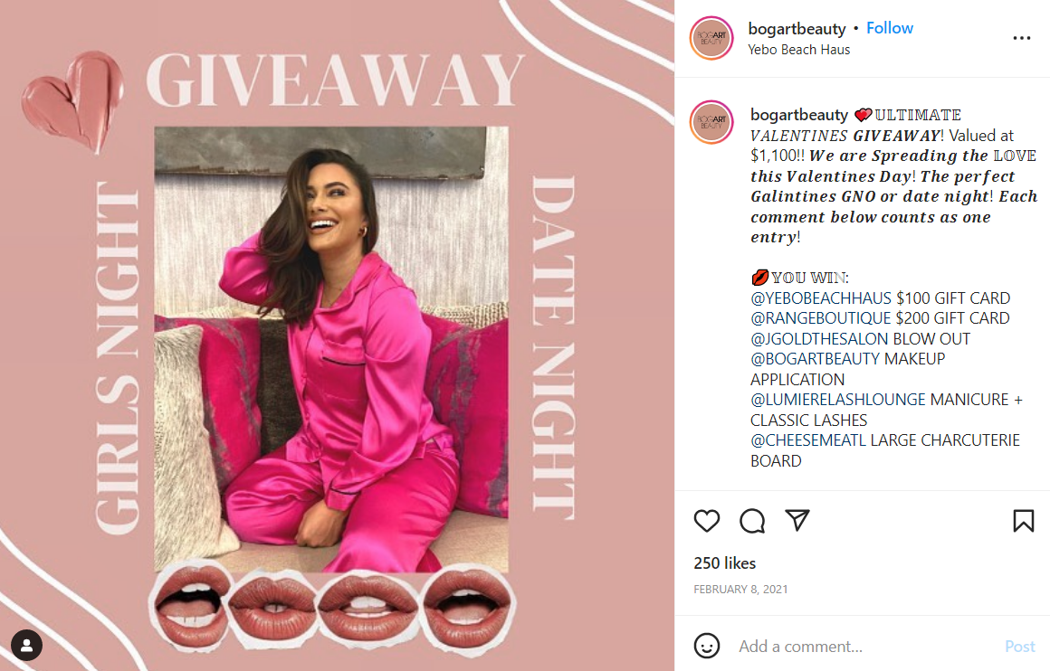 - Users must engage with the post (comment or tag users) to enter. Following brand partners are also necessary to enter. These entry methods will ensure that engagement and follower count are increased.